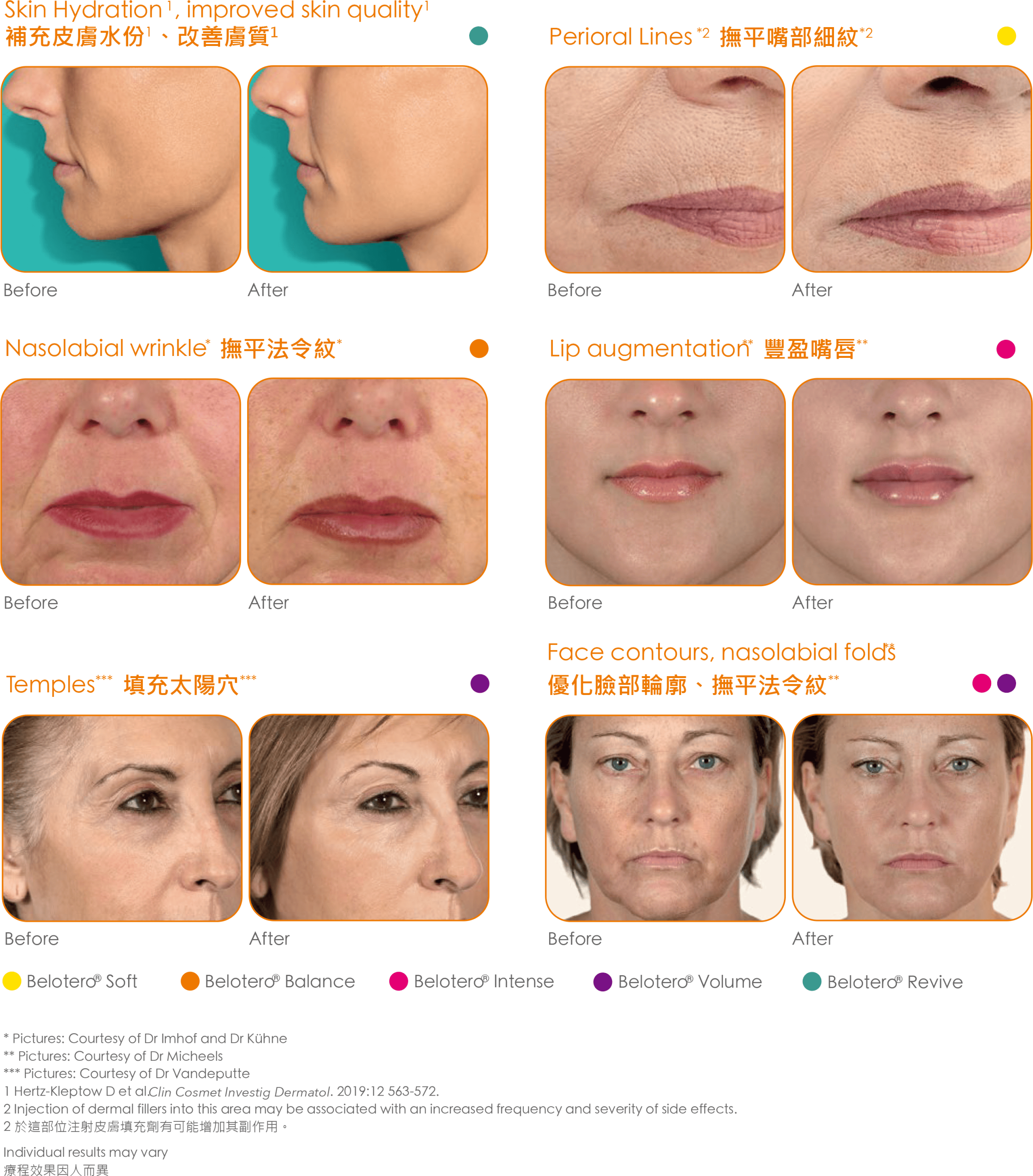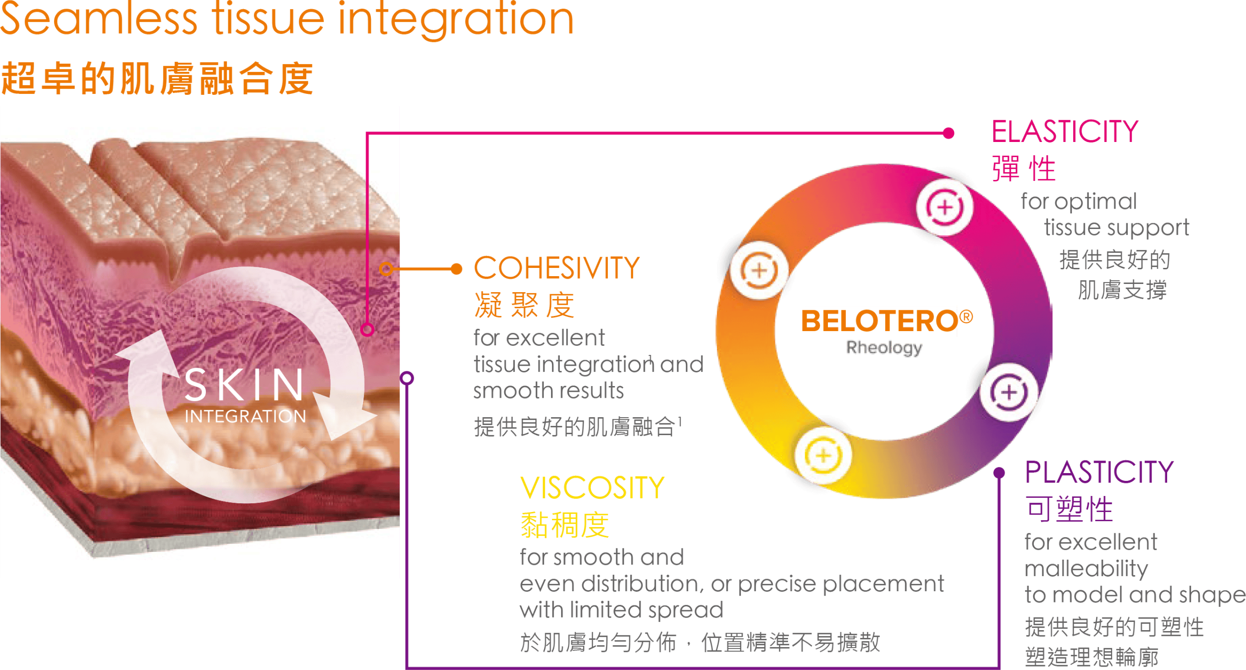 Belotero® 透明質酸系列的優勝之處在於其四個特點 (凝聚度、黏稠度、彈性及可塑性) 的均衡比例,所以能無瑕地融合到皮膚中,並與肌膚組織整合,提供可預測的自然效果。