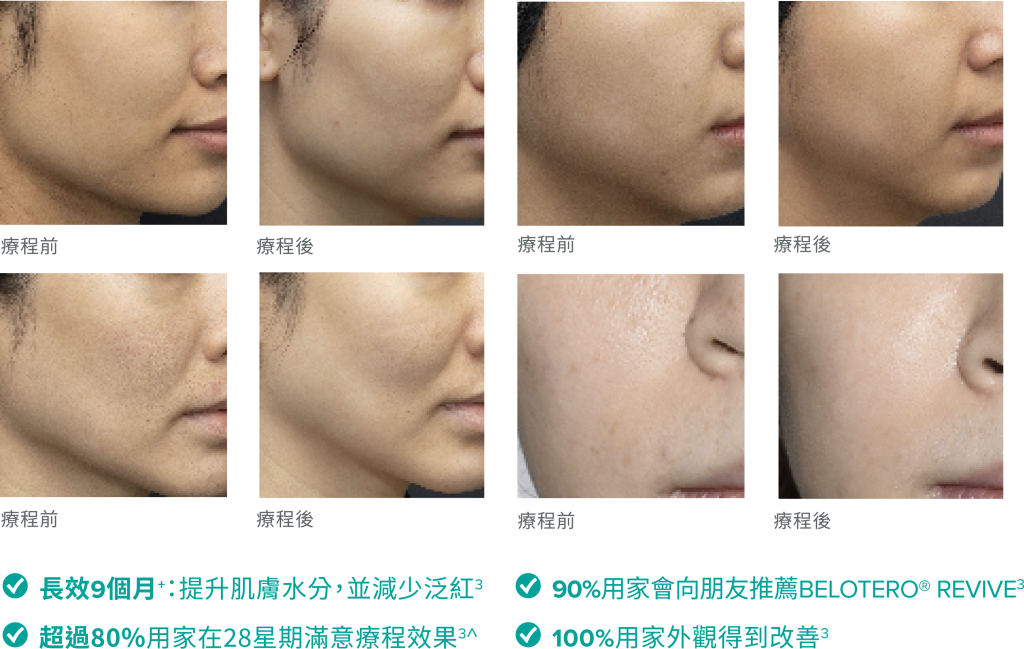 BELOTERO® REVIVE是全港唯一結合透明質酸和甘油的水光針,幫助肌膚從內到外恢復水潤光澤及飽滿, 更現年輕。BELOTERO® REVIVE獨有保濕鎖水配方,强化保濕效能,比大部分護膚品更能深入肌底,直接將透明質酸和甘油成分滲透至肌膚底層,增加肌膚水潤 度及光澤度,煥發自然裸光肌。透過BELOTERO® REVIVE 全方位改善膚質,迅速高效地為肌膚打好基礎,從而簡化日常繁瑣的護膚程序,成爲您日常護膚步驟前不可或 缺的Step Zero™ 。