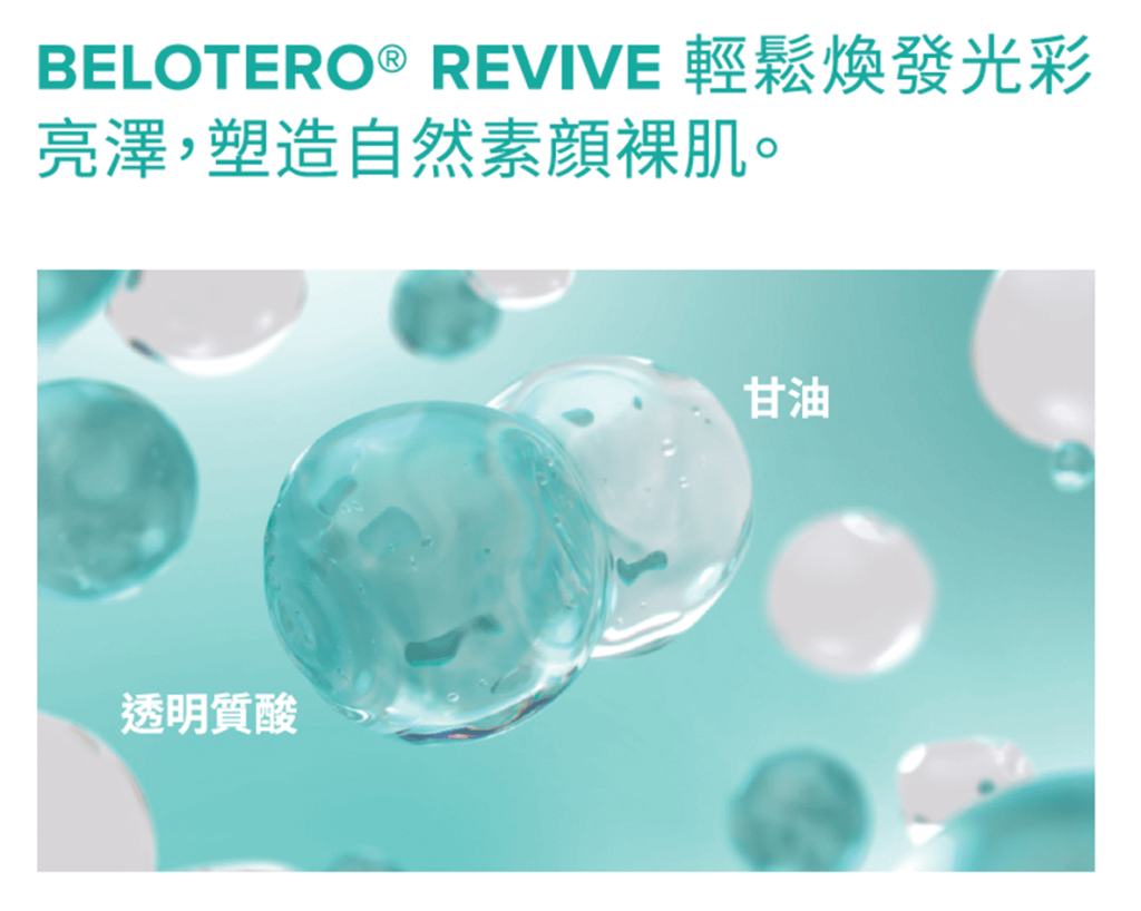 BELOTERO® REVIVE 獨有保濕鎖水配方,結合透明質醣和甘油,加強肌膚的水潤和健康,讓您看起來 更年輕丶容光煥發。透明質酸是天然存在於人體的保濕因子,能夠承載自身重量多達1000 倍的水分,為肌膚提供保濕和支撐作用。甘油是另一種強效保濕成分,有效鎖緊肌膚中的所有水分透明質酸和甘油兩種保濕因子的協同作用有助強效保濕鎖水,塑造持久光澤。