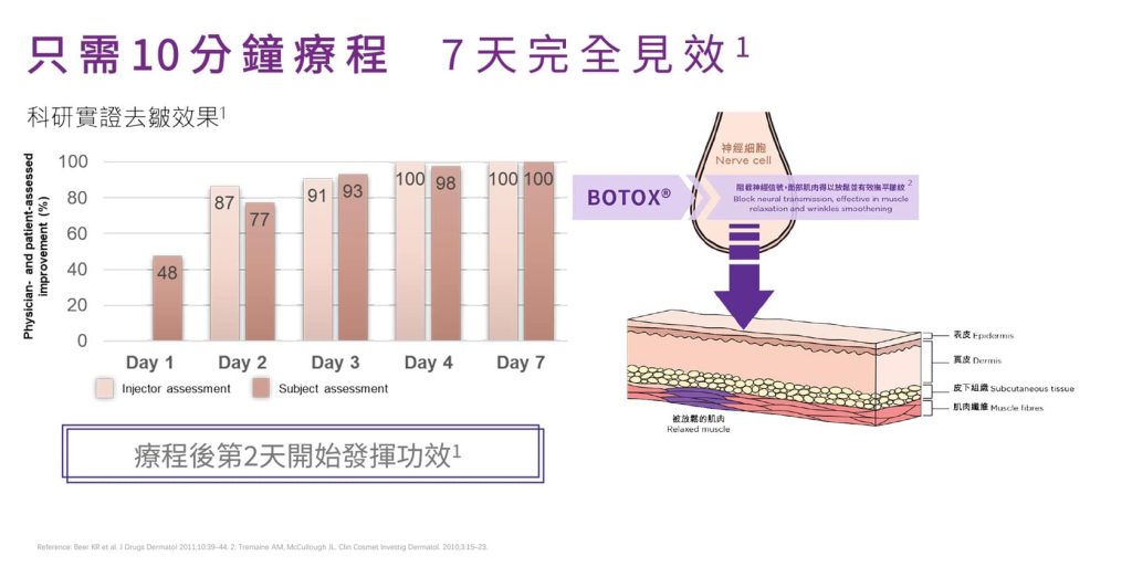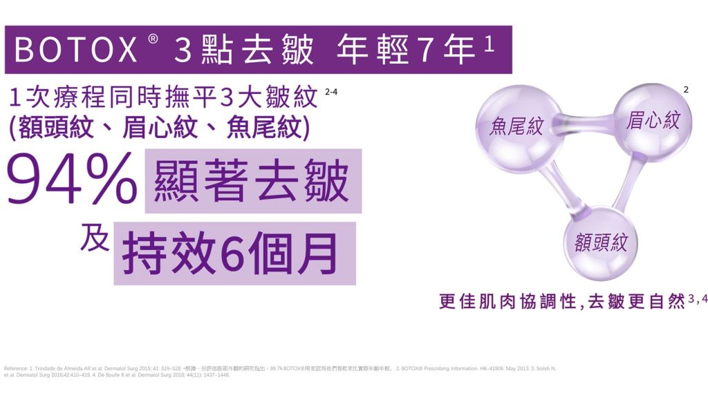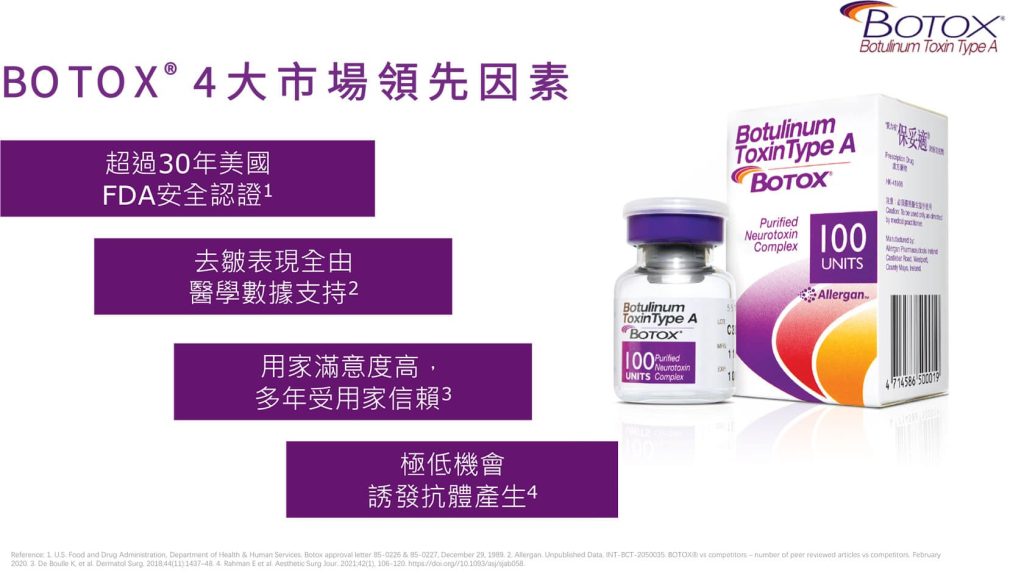 保妥適 (Botox)是由美國Allergan藥廠生產的A型肉毒桿菌素品牌,是一種透過阻斷神經 與肌肉間信號,使過度收縮的肌肉放鬆的注射型美容及治療產品。它主要用於減淡動態 皺紋(如魚尾紋、抬頭紋)、瘦面(咀嚼肌)、瘦小腿、提升輪廓、止汗(腋下)及肌 肉痙攣。療程通常在注射後數天顯現效果,維持約 4-6 個月。
