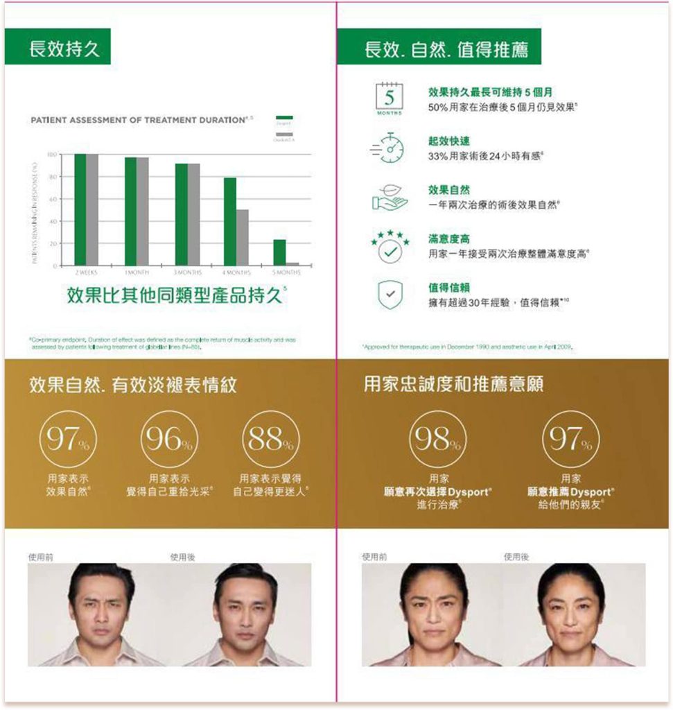 Dysport® 是歐洲A型肉毒桿菌素,在嚴格監管的美國食物藥品監督管理局 (FDA) 核准, 英國原廠生產,於韓國及歐洲已被廣泛使用,特別適合亞洲人肌膚。療程透過令過度收 縮的肌肉好好放鬆,達至瘦面、瘦小腿效果;亦能抑制汗腺排汗的神經系統,有效減少 汗水分泌,達致異味減少。臨床研究顯示,極少副作用。Dysport® 經過十多年的臨床驗 證及科研發展,現已獲得 60 多個國家的授權及註冊,並獲香港衛生署認可。
