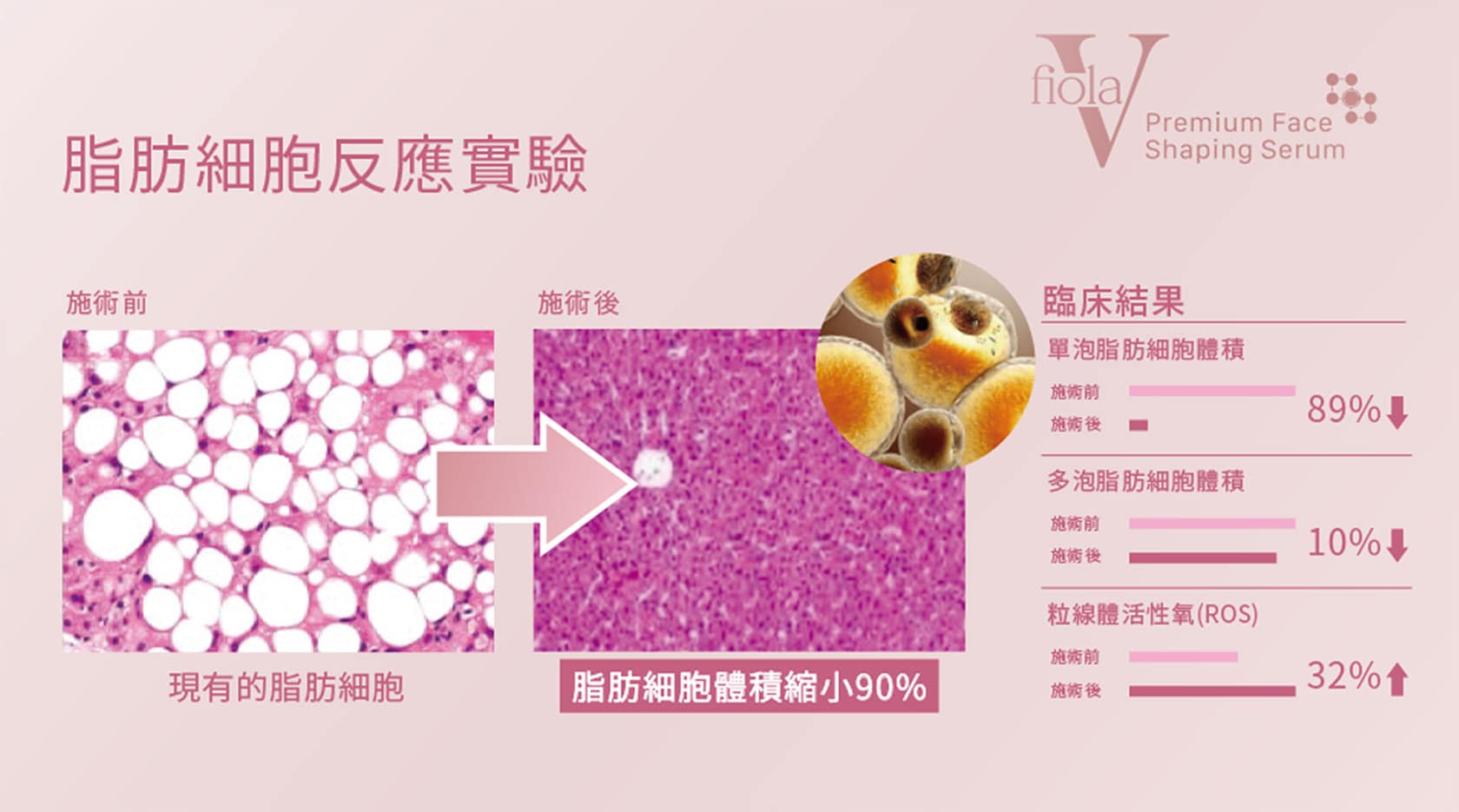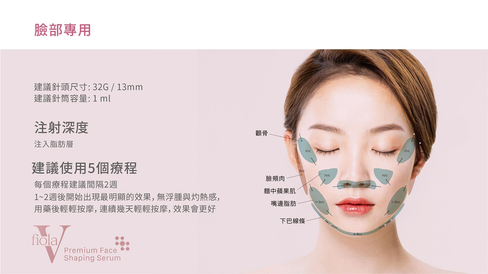 Fiola V 代表了一種突破性的臉部輪廓解決方案,旨在快速有效地消除臉部多餘的脂肪堆積。 Fiola V 的主要優點之一是減少體內脂肪細胞的體積、基本無恢復期、無疼痛或紅腫不良反應,受用於均勻縮小局部面積、讓臉部線條更加流暢、表面更加平滑、不會引起皮膚塌陷。