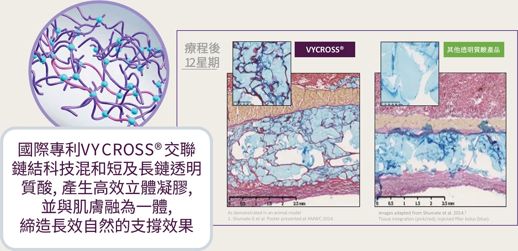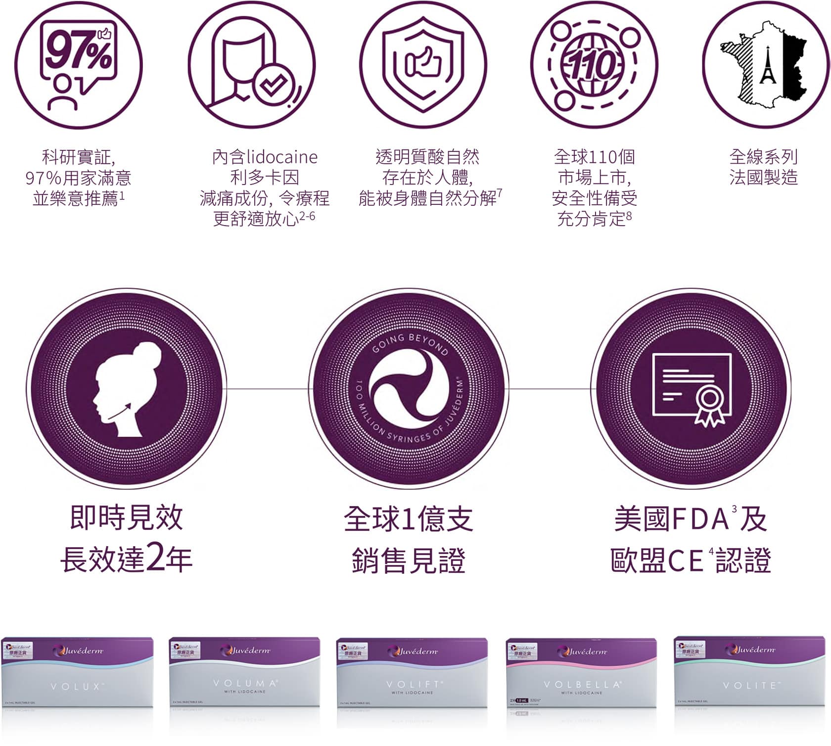 Juvéderm® 透明質酸成份天然,加上專利技術VYCROSS™ 交聯鏈結科技,能與肌膚自然融 為⼀體,療程效果即時而持久。另外,Juvéderm® ⻑效透明質酸系列設有不同濃度,適用於 臉部不同位置和需要。Juvéderm® 美感療程可以幫助發現衰老跡象的人士改善面型輪廓,逆 轉骨骼流失及脂肪流失下移做成的輪廓下垂。另外,Juvéderm® 美感療程亦可以修飾面型, 令面部更接近黃金比例。
